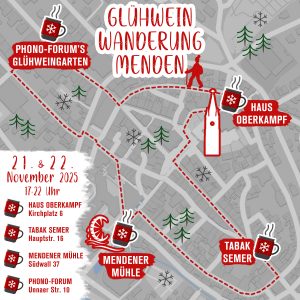 Die 4. Mendener Glühweinwanderung findet am Freitag 21. und Samstag 22. November jeweils von 17 bis 22 Uhr statt und die Teilnahme ist kostenfrei. Der Rundgang verläuft durch die Altstadt von Menden mit den vier weihnachtlichen Glühweinständen beim Haus Oberkampf, Tabak Semer, der Mendener Mühle und phono-forum´s Glühwein Garten bei der ehemaligen Fahrschule Weber in der Unnaer Straße. Die Organisatoren empfehlen den Wander*innen erneut sich ihre eigene Tasse mitzubringen. Mit einem Augenzwinkern wird von den Organisatoren versichert, dass Teilnehmer, die ihre Tassen vergessen, nicht leer ausgehen werden. Es werden vor Ort kostenfreie ökologisch abbaubare Pappbecher, aber auch GlühweinWanderung-Tassen angeboten. Der Erlös der verkauften Tassen wird für einen guten Zweck gespendet.